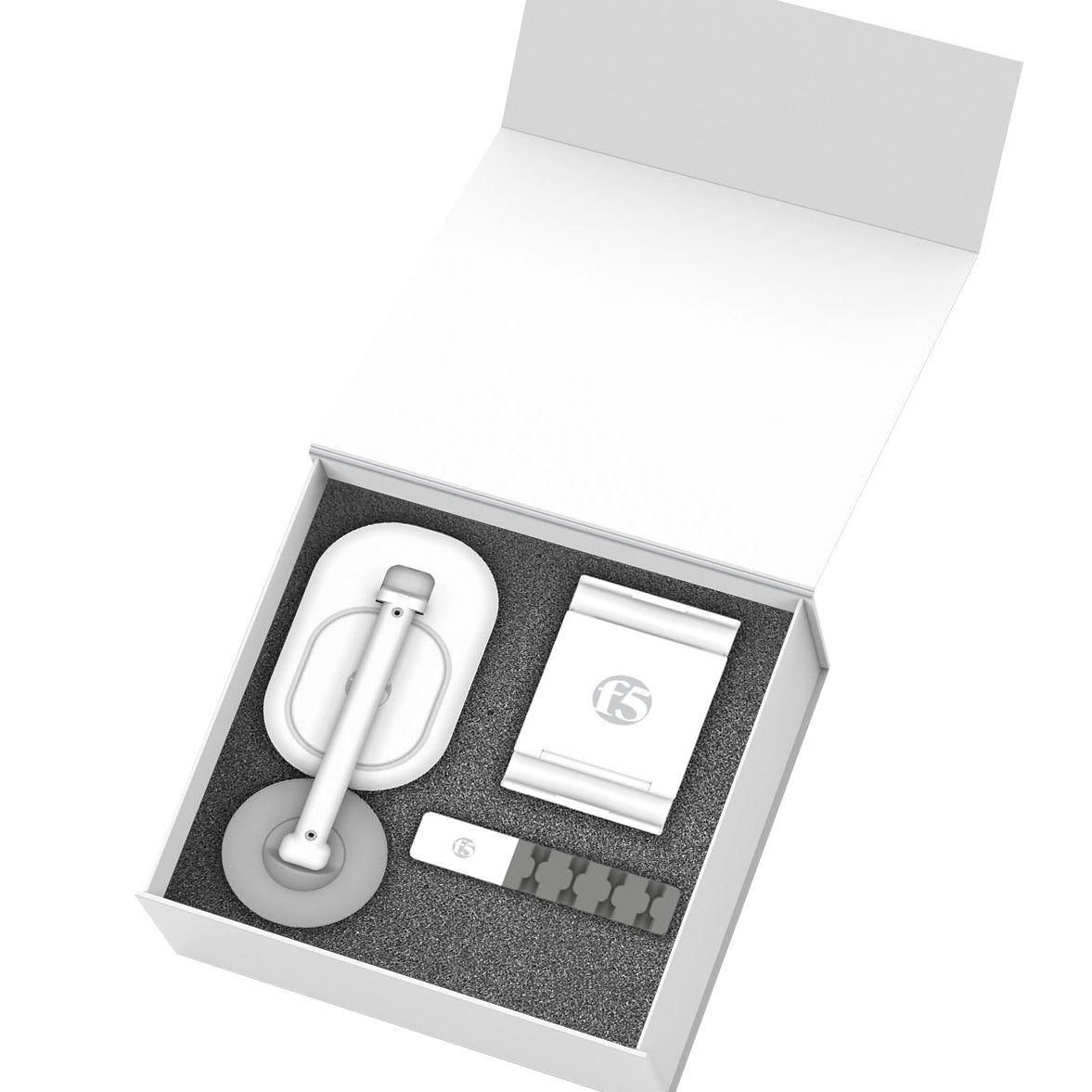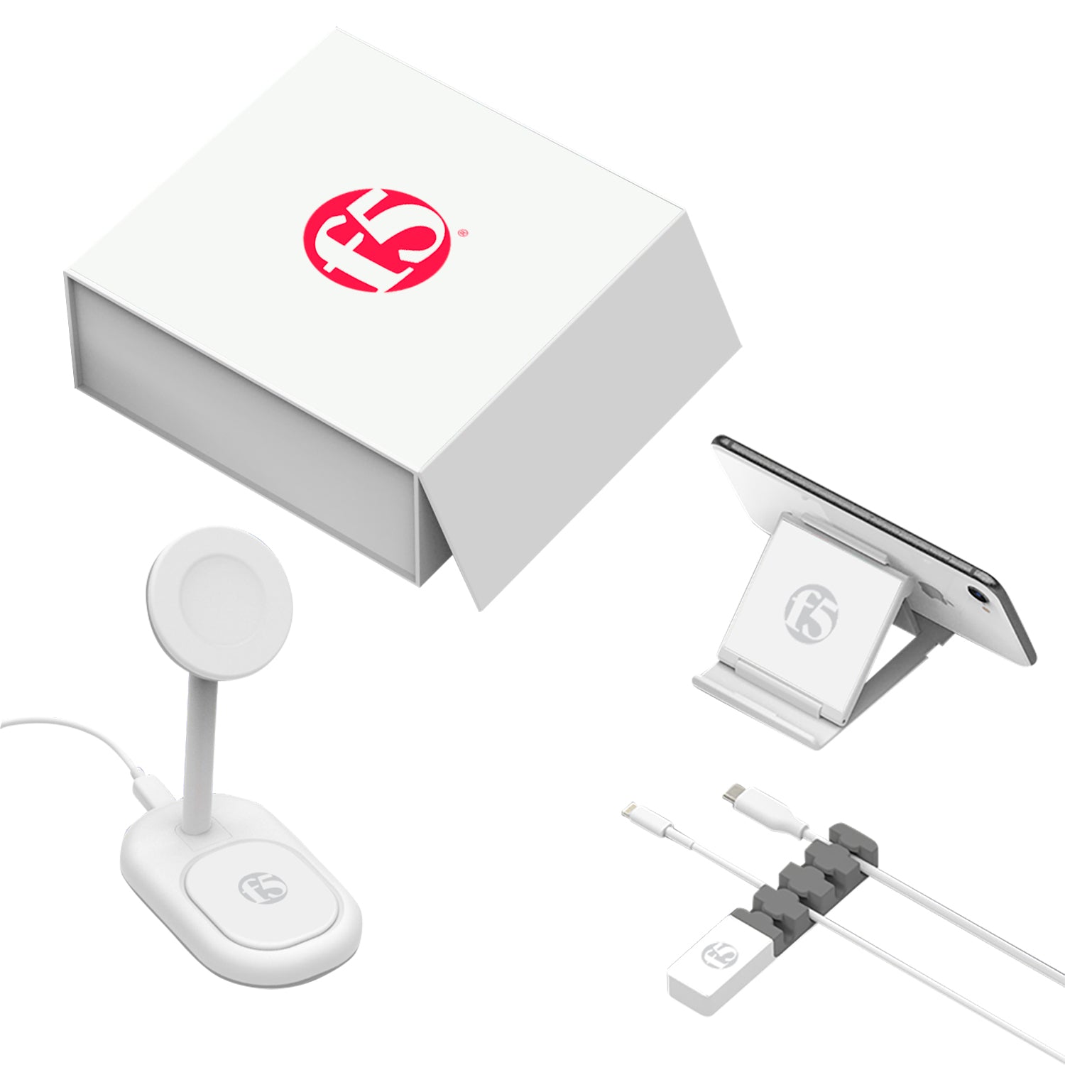 Whether you’re working from home or the office, the DeskSaver Power Kit is sure to improve any workspace. The kit is beautifully packaged in a white gift box with magnetic flap closure. Three practical desk items (MagStand Charger, FoldStand, and CableCatch) are securely displayed in the foam insert. F5 branding on the box and desk items.